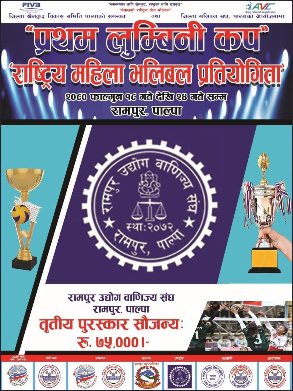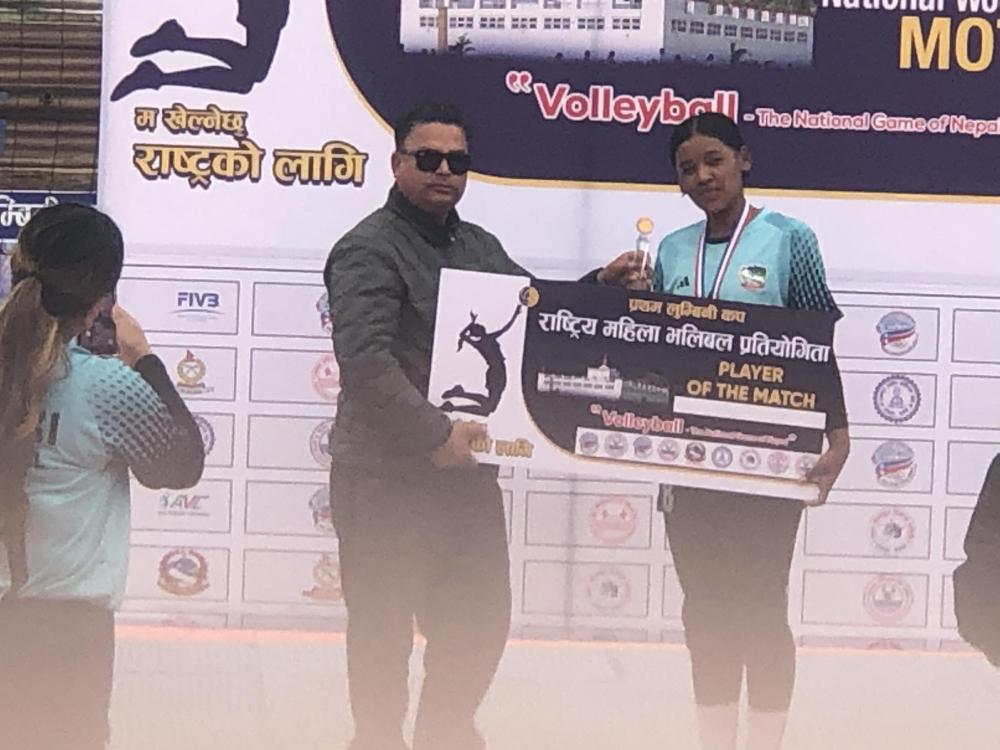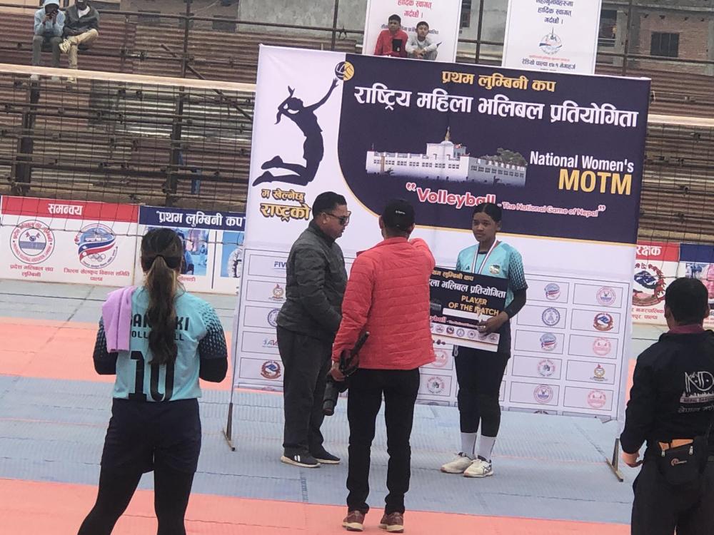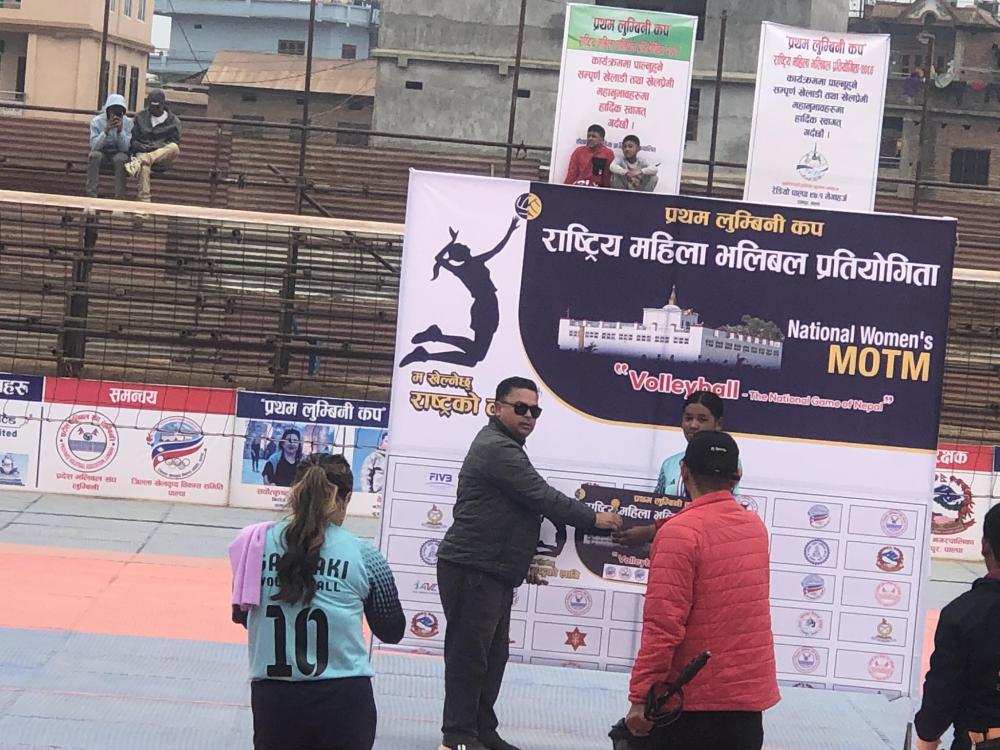 प्रथम लुम्विनी कप महिला भलिवल प्रतियोगितामा तृतीय पुरस्कार हस्तारण गर्नुहुदै संघका अध्यक्ष श्री भोजेन्द्र प्रकाश ढकाल ज्यू