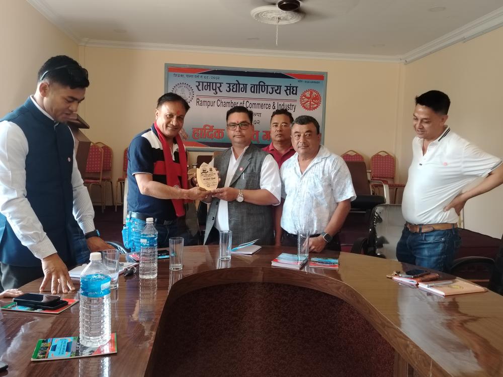 आज मिति २०८२ वैशाख महिनाको २८ गते मकवानपुर उद्योग वाणिज्य संघबाट अध्ययन अवलोकन भ्रमणको शिलशिलामा आउनुभएका संघका अध्यक्ष, केन्द्रीय सदस्य, जिल्ला समन्वय प्रमुख लगाएका आदरणीय व्यक्तित्व ज्युहरुलाई रामपुर उद्योग वाणिज्य संघमा स्वागत गरियो ।