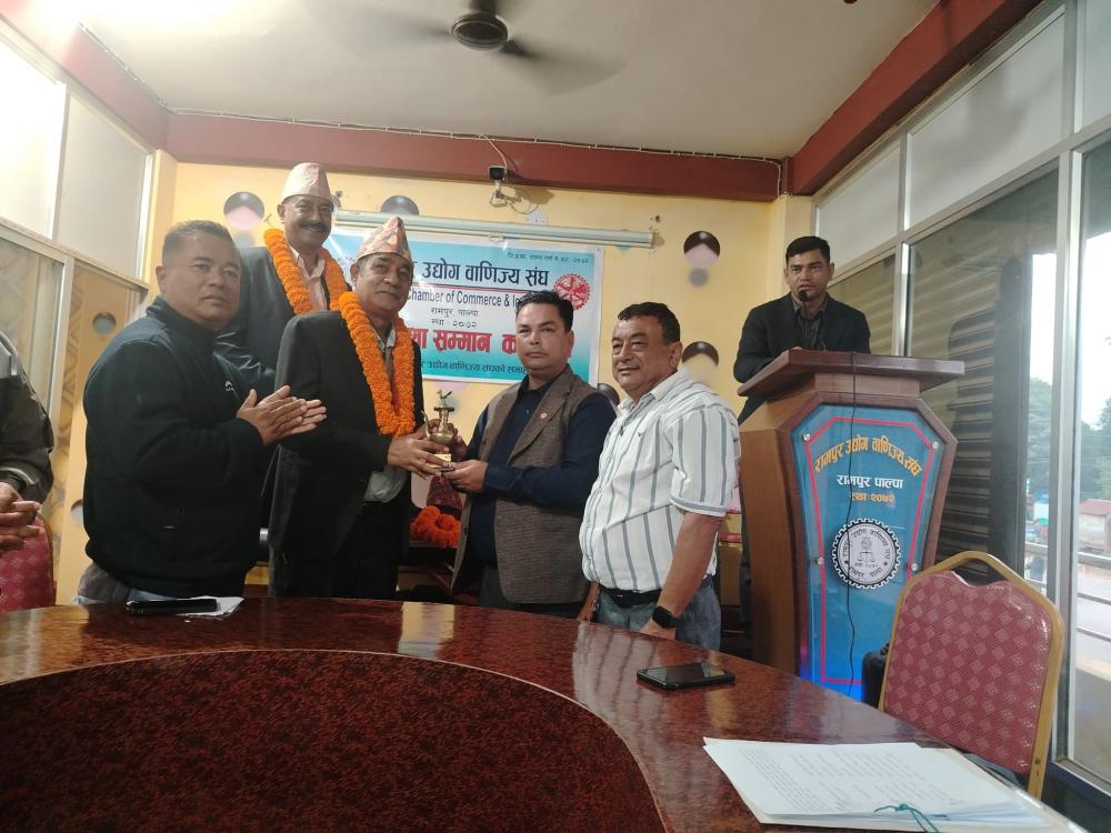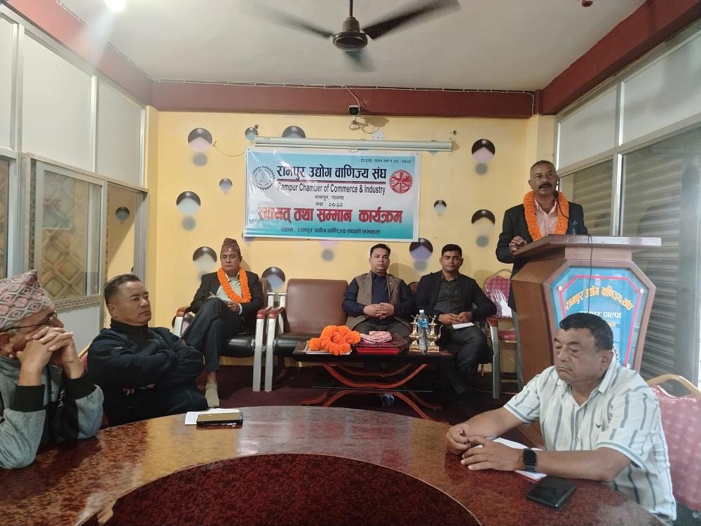 मिति २०८१ कार्तिक २४ गतेका दिन रामपुर उद्योग वाणिज्य संघ निरीक्षणको सिलसिलामा नेपाल उद्योग वाणिज्य महासंघका जिल्लारनगर उपाध्यक्ष श्री सुर कृष्ण वैद्य ज्यु र नेपाल उद्योग वाणिज्य महासंघ लुम्बिनी प्रदेशका अध्यक्ष श्री कृष्ण प्रसाद शर्मा ज्युको गरिमामय उपस्थिति रह्यो। सोही अवसरमा परिचयात्मक एवम् स्वागत सम्मान कार्यक्रम संघको सभाहलमा सम्पन्न गरियो ।