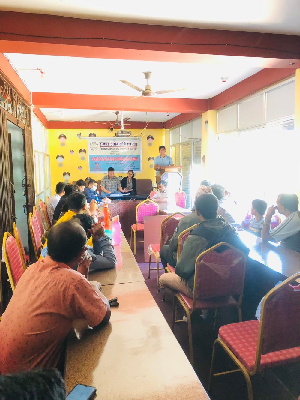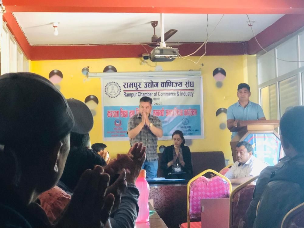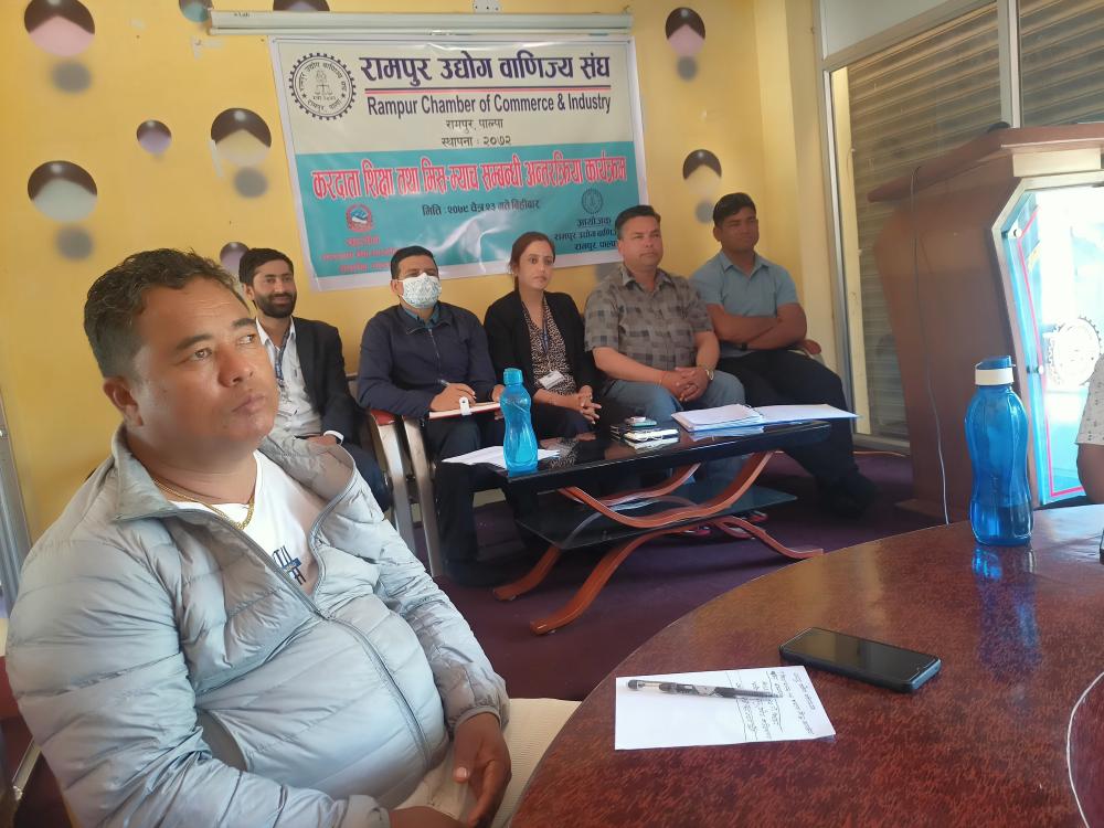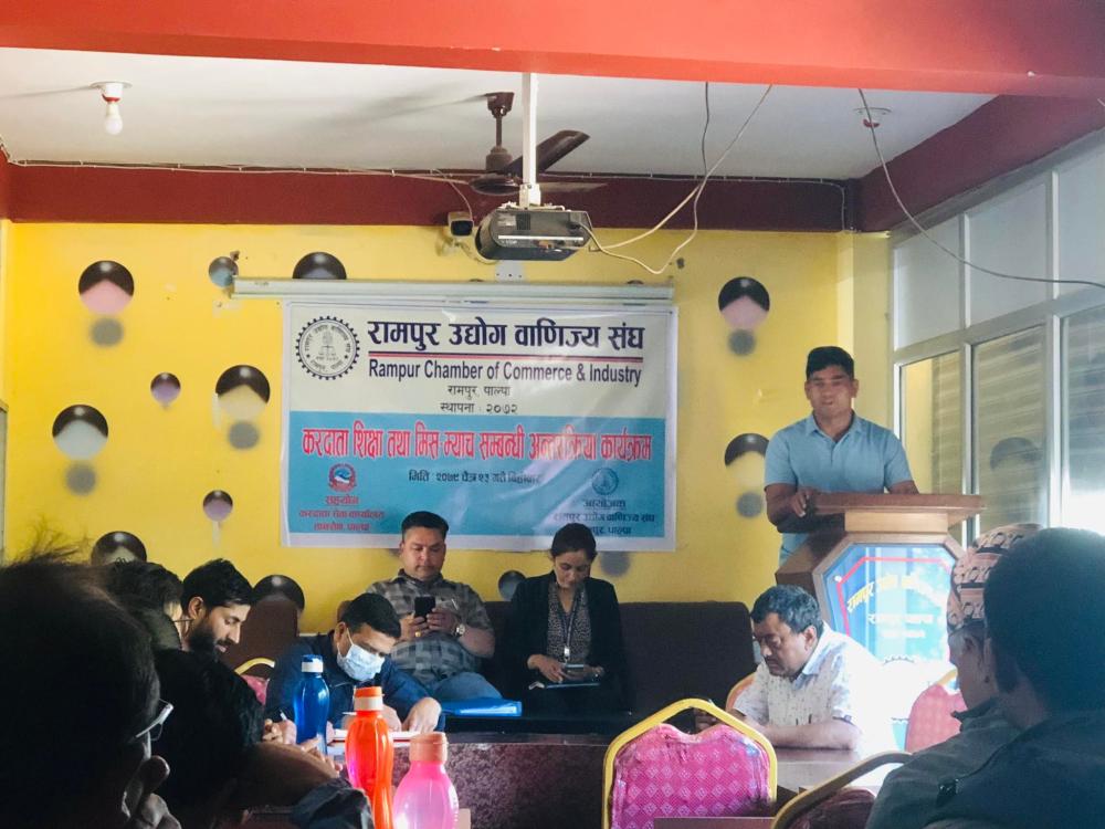 रामपुर उद्योग वाणिज्य संघको आयोजनामा करदाता सेवा कार्यालय तानसेनको सहयोगमा करदाता शिक्षा तथा मिसम्याच सम्बन्धि अन्तरक्रिया कार्यक्रम २०७९ चैत्र २३ गते बिहीबारर
